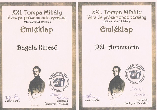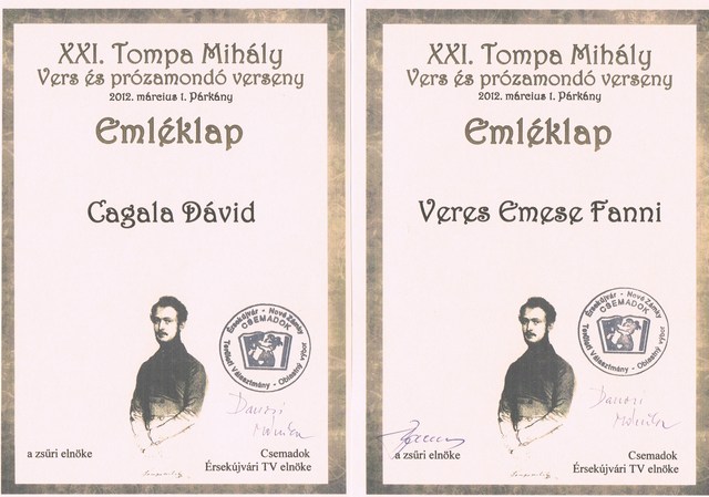 2012. március 1- jén megrendezésre került Párkányban a a XXI. Tompa Mihály Vers és prózamondó verseny körzeti fordulója, ahol 7 tanuló képviselte iskolánkat: Bagala Kincső, Hájik Vivien, Veres Emese Fanni, Cagala Dávid, Merva Izabella, Kormos Bence és Péli Annamária.